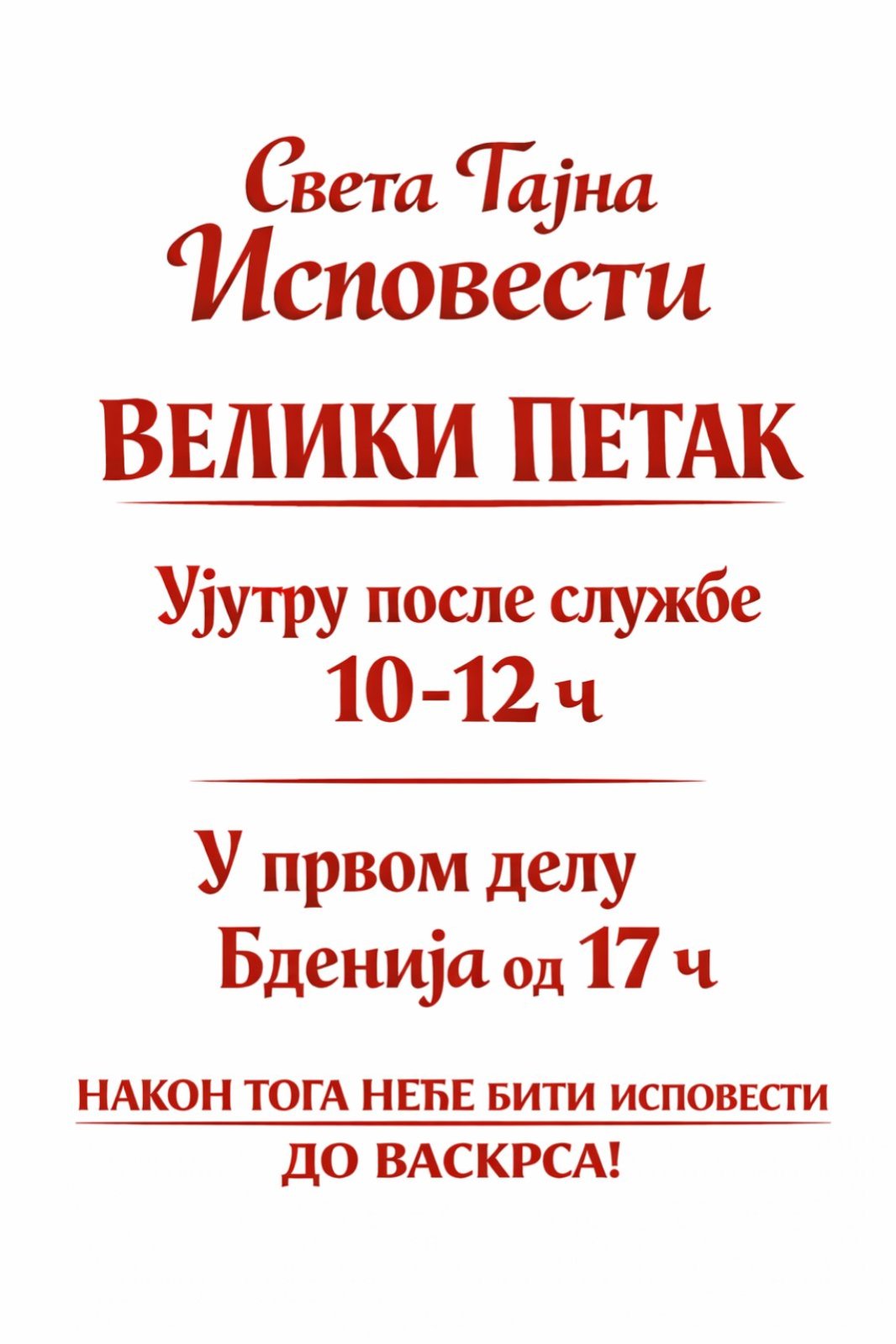 РАСПОРЕД ИСПОВЕСТИ ЗА ВЕЛИКИ ПЕТАК 2026
